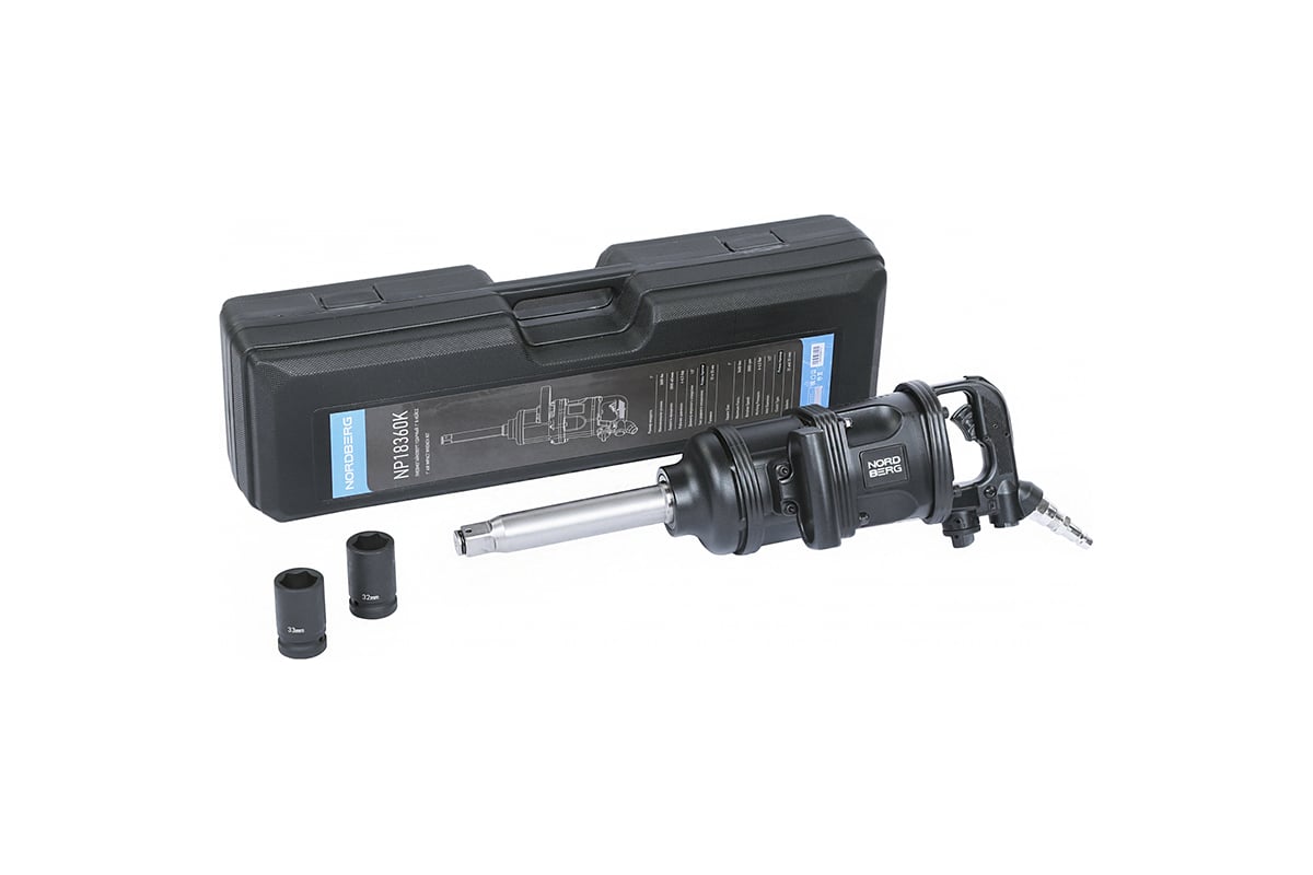 Пневмогайковерт ударный 1", 3600 Нм, в кейсе с головками 32 и 33 мм NORDBERG NP18360K